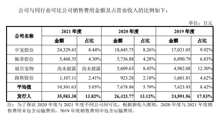 中宠股份与佩蒂股份的三年复合增速略高于乖宝宠物,但在绝对数额上并不能和乖宝宠物相竞争。不过,乖宝宠物更高的销售额也伴随着更多的销售费用。根据乖宝宠物7月20日更新的上会稿,该公司销售费用占营业收入的比例是现有宠物类上市公司中最大的,光是2021年就耗费了4.59亿元人民币在销售费用上。