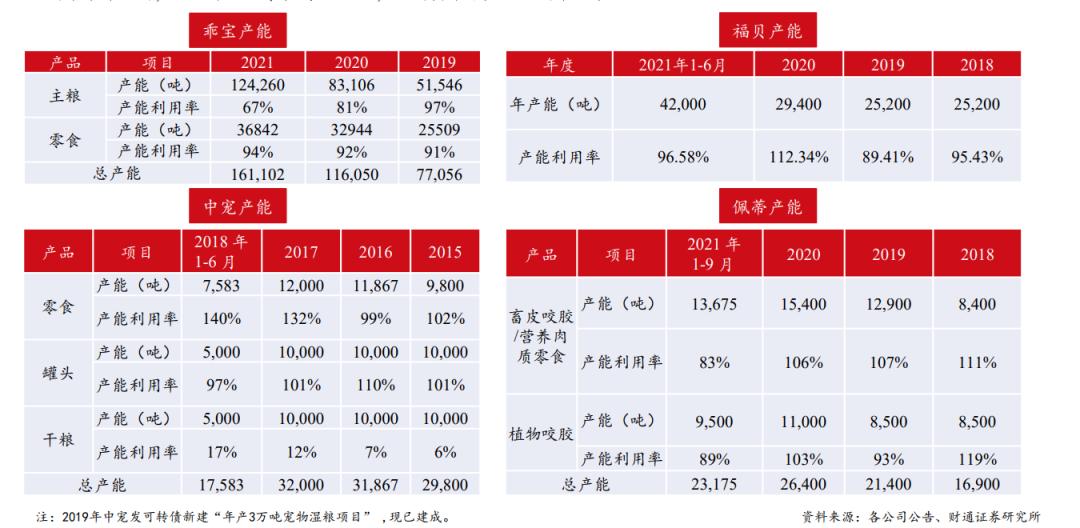 根据财通证券研究,乖宝宠物目前已经是同行业公司中产能最大的公司。2021年主粮产能12.42万吨,零食产能3.68万吨。相较于现有产能,乖宝宠物IPO预计能增加47%的主粮产能和近10%的零食产能。