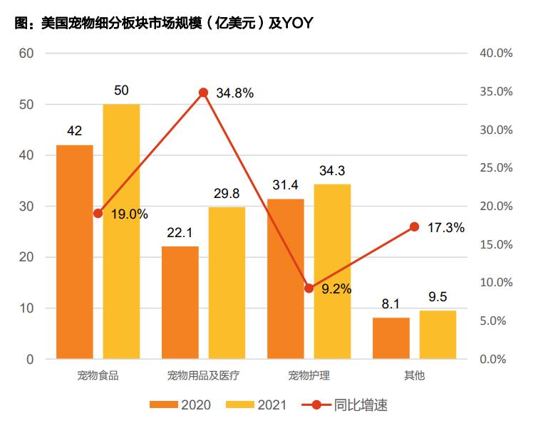 据天风证券研报,“自疫情以来,美国已新增约900万只/500万只宠物狗/猫,增幅分别为9%和7%。2021年美国宠物市场规模达1236亿美元,同比增长近20%,与2019年同比增速相比,增加12个百分点,远超疫情前,实现高基数下的高增长”。