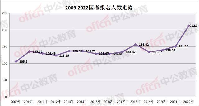 2022年,国家考公报名人数达到202万,最终通过审查人数183万人,而考试仅仅开放16745个岗位、招录31242人,全国平均竞争比68.9:1,职位最大竞争比达到19236:1。