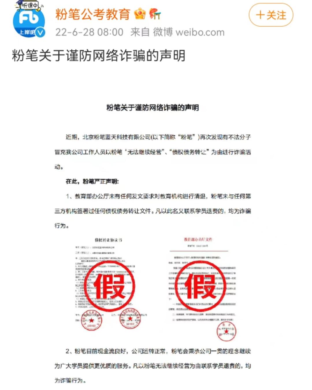 甚至连骗子都知道这些机构的难处,谎称粉笔“无法继续经营”“债权债务转让”要给学员退费,粉笔连忙出来澄清自己现金流良好、公司运转正常。