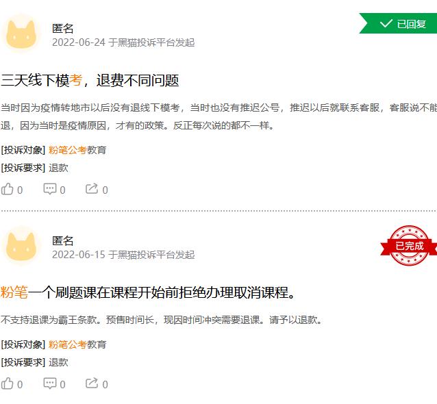 搜索发现,截至7月21日,中公教育的投诉量最大,达到14317条;华图教育累计投诉量1194条;粉笔公考在黑猫投诉的投诉量超过716条。