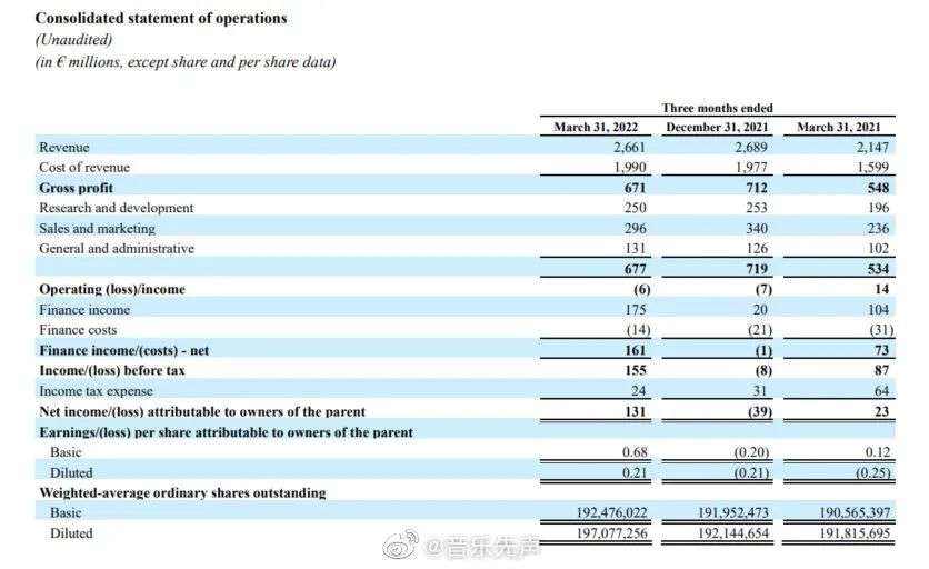 但运营情况仍不如人意,Spotify今年一季度的运营亏损 600 万欧元,而上一季度的运营亏损为700万欧元。 重要原因,就在于内容成本高企,比如Spotify的内容成本高达19.90亿欧元,在总营收的占比超过74.78%,这也让Spotify在十余年的绝大多数时间都是亏损状态。