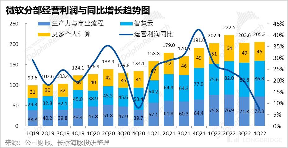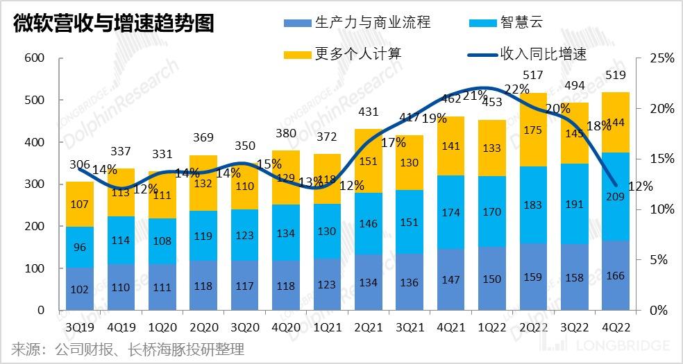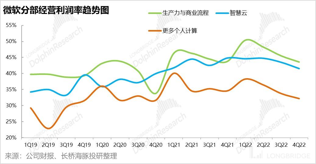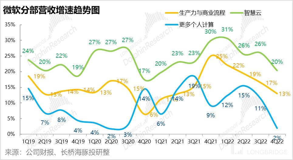 由于 Azure 业务增速的放缓,以及非 Azure 服务(SQL server,Visual Studio 等)营收增速由上季度的低各位数增长,到本季-3% 的收缩;智慧云业务本季整体实现 209 亿美元的收入,稍稍低于市场预期的 211 亿营收。同比增速也由上季的 26% 下滑到 20%。可以推断,在美国企业也进入裁员控费的氛围时,对云服务等 IT 功能的投入也在收缩。