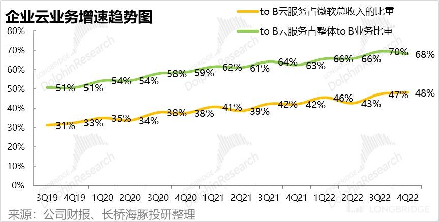 随着微软企业端云业务的营收增速下降,2B 云业务在微软中的收入占比提升也在放缓,但仍在继续。据海豚君计算,2B 云业务占公司中营收的比重已达 48%,较上季进一步提升了 1pct。
