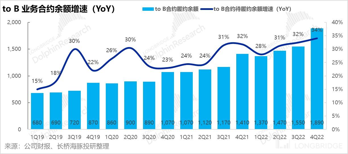 本季度未,面向企业端的合同金额余额(也即递延收入 + 未确认收入的合同金额)为 1890 亿,不仅绝对值上创新高;同比增速更是进一步提速到 34%。可见虽然本季确认收入的节奏放缓,但未来可确认的余粮还是相当充沛。