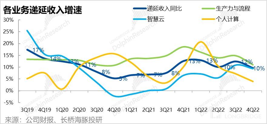 从结构上看,各业务的递延收入增速都有所回落,但还是 “无足轻重” 的个人计算业务下滑最显著,关键的生产力业务和智慧云务递延收入增速下降的幅度不大,因此微软核心业务的短期营收余粮也还是无忧。