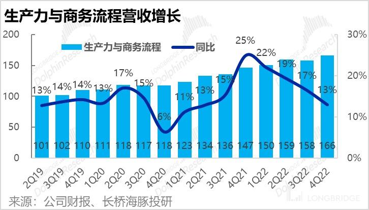 由于各细分业务的增速都有所放缓,本季微软生产力和商务流程板块的整体营收为 166 亿元,与市场预期的 167 亿基本一致,同比增速也由上季的 17% 继续下滑到 13%。