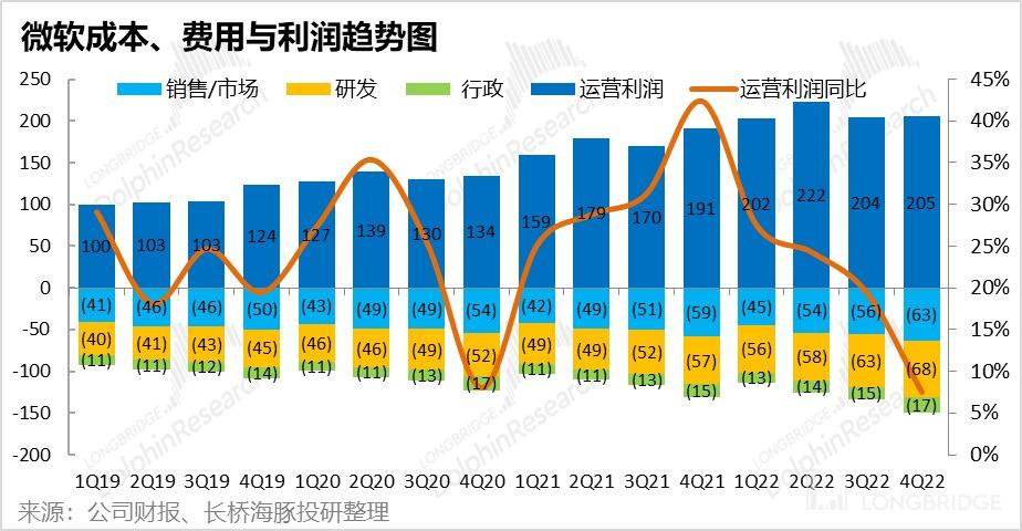 不过,在通胀大背景下,公司的运营费用看来短期内不会缩窄,仍会保持在 148 亿-149 亿美元之间,与本季度基本一致。因此,下季度微软有望实现经营利润 213 亿元,经营利润率相较本季也会略微改善到 40.2%。