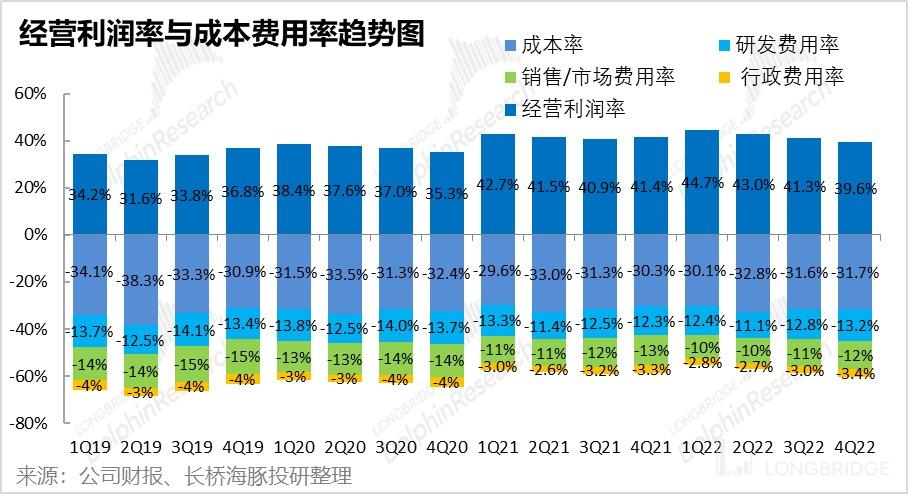(3)毛利虽略低于预期,但公司的控费措施效果不错。公司原先指引本季运营费用在 148-149 亿间,而在通胀的大环境下,实际费用支出为 149 亿美元,并未超出指引。三费支出详细来看,仅有关键的研发费用率有所扩张,而营销投入和行政费用率在管控之下基本持平甚至有所缩窄,因此并未进一步拖累盈利。