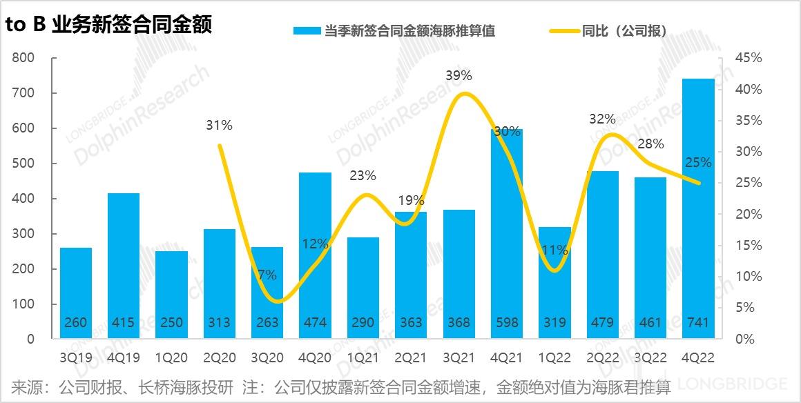 在合同余额提速增长的同时,微软本季新签 2B 合同金额达到了 741 亿美元,虽然同比增速略有下滑,但更多是因为基数增长的原因。本季新签订单金额的绝对值同比多增了 143 亿元,再创新高。