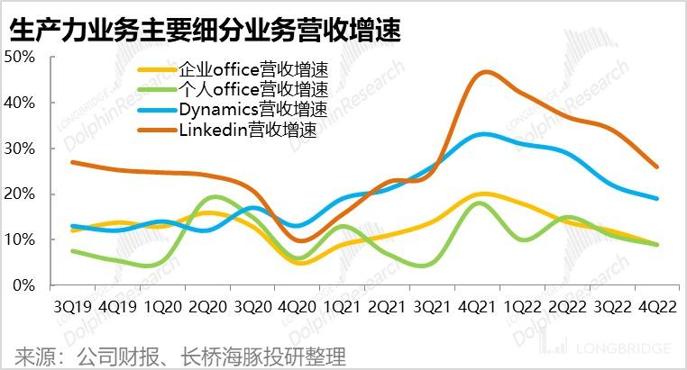 除了核心的企业 Office 业务外,生产力与商务流程板块内的其他业务基本呈现了类似的营收放缓幅度。