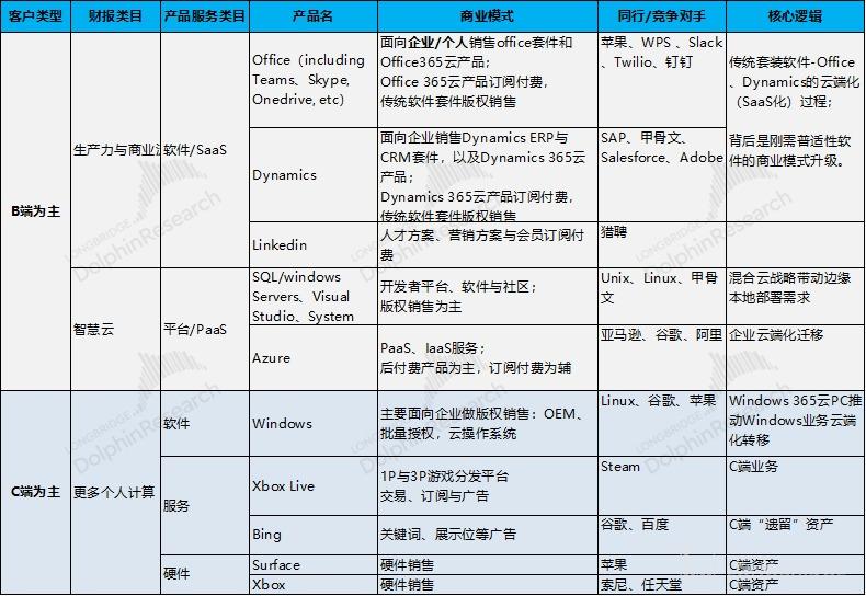 3. 更多个人计算业务,如 C 端产品 Surface、Xbox 等硬件、游戏业务、Bing 搜索,包括 Windows 业务在内,更多是微软在移动时代博弈失败的遗留资产,三大业务中战略地位最低。
