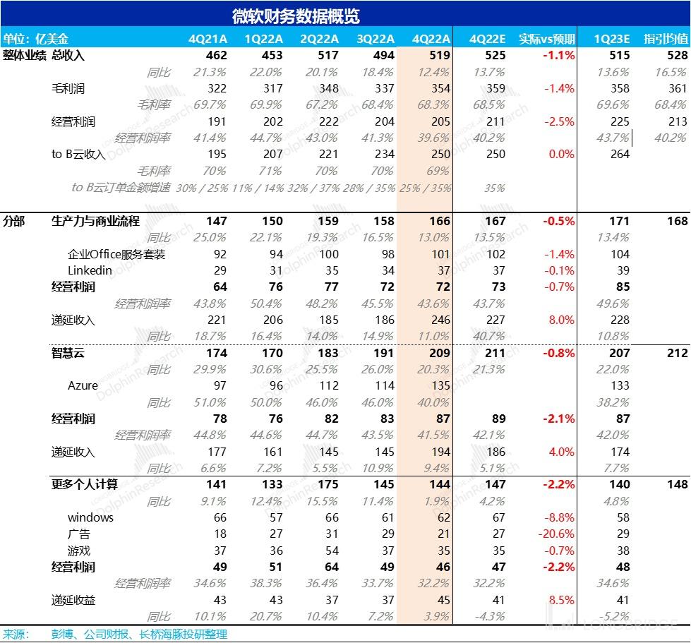 1.整体业绩略不及预期:微软本季实现总营收 519 亿美元,略低于市场预期的 525 亿。本季实现经营利润 205 亿元,同样略低于预期的 211 亿。不及预期的主要原因还是在欧美通胀,中国疫情、以及美元升值的宏观背景下,公司营收所受的负面影响比预料中更大。