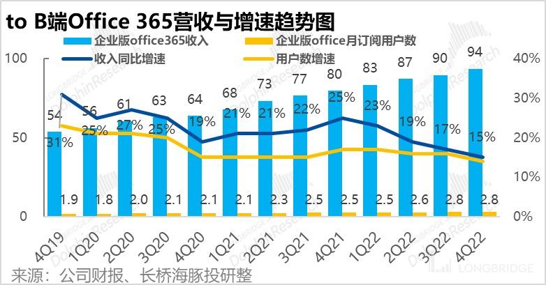 2022 财年四季度,微软面向企业的办公 SaaS 产品 Office 365 实现收入 94 亿美元,同比增长 15%,在云端化红利末期,收入增速持续在放缓。