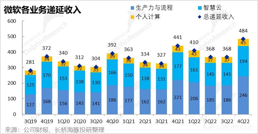 SaaS 化服务 Office365 以用户订阅为主,C 端业务的 Game Pass,以及 Azure 中也有部分用户订阅,这会产生大量实际已经收到钱但仍然待确认为实际收入的递延收入,且此种递延的入账确定性非常高。