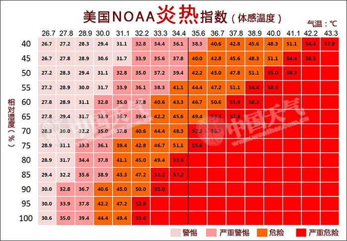 美国国家海洋暨大气总署(NOAA)曾经出过一份湿度与温度对照表,大家可以对照着算算自己所在的城市,目前真实的体感温度到底是多少。