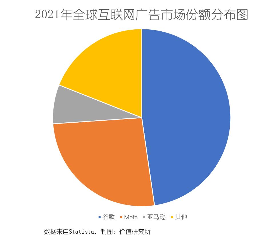 在互联网广告这块阵地,搜索是一个十分重要的板块,谷歌则是该领域的绝对霸主。数据显示,2021年谷歌广告收入1489.51亿美元,在互联网广告市场占有率达到47.7%,占比是第二名的Meta(占有率26.2%)的接近两倍。