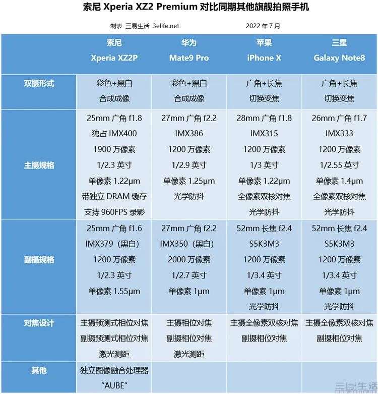 为了让大家更清楚地看到索尼XZ2P相机硬件设计在当时有多么与众不同,我们将其与同时代的其他多款旗舰机型进行了一个简单的对比。可以看到,一方面与同期的iPhone X、三星Galaxy Note8等机型相比,索尼XZ2P并没有使用更“新潮”的变焦双摄布局,而依然用着较为早期、基于彩色+黑白的双摄合成方案。