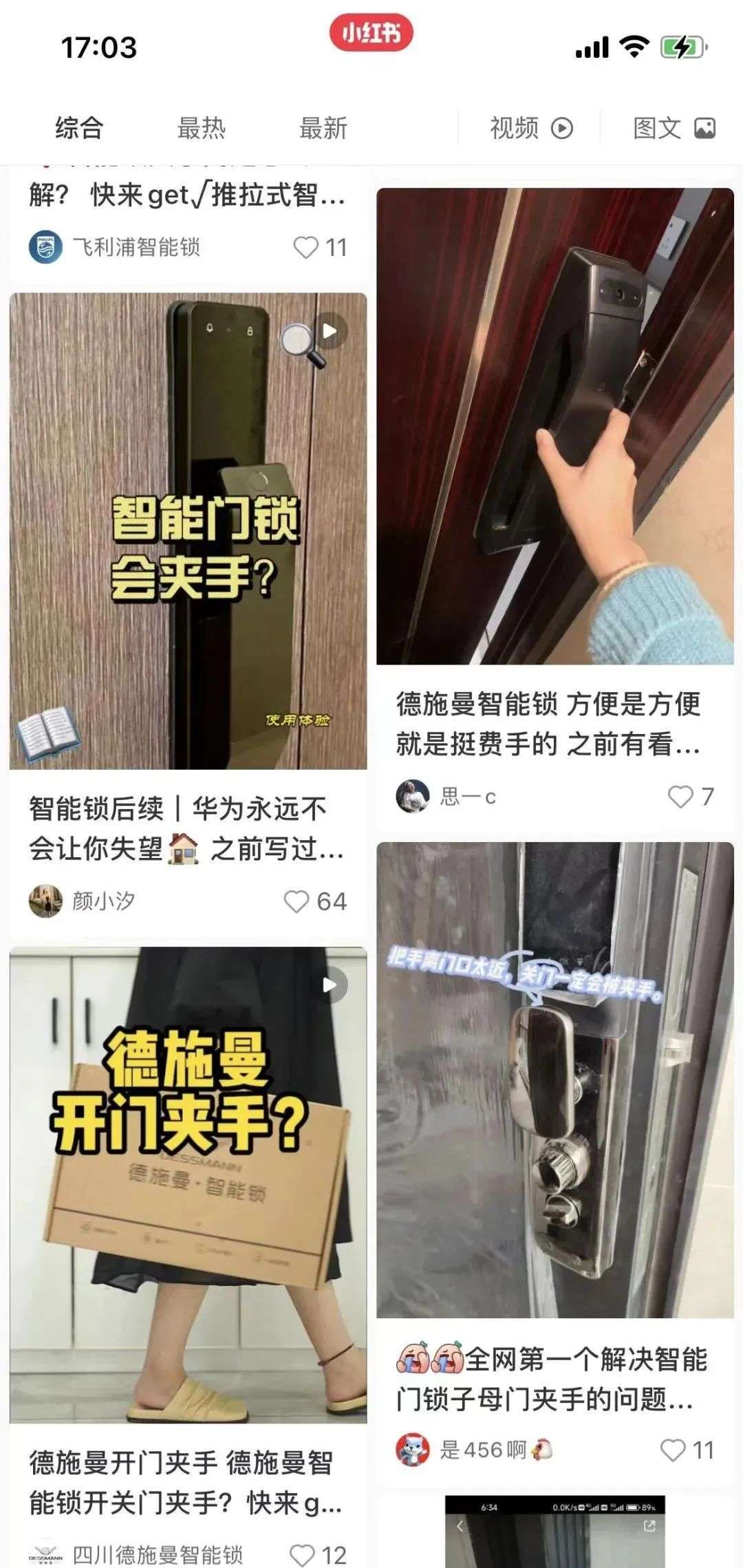 在小红书社交平台上,“智能门锁”词条的出现频率极高,达到5万多条,几乎能够追赶关键词“入户门”。
