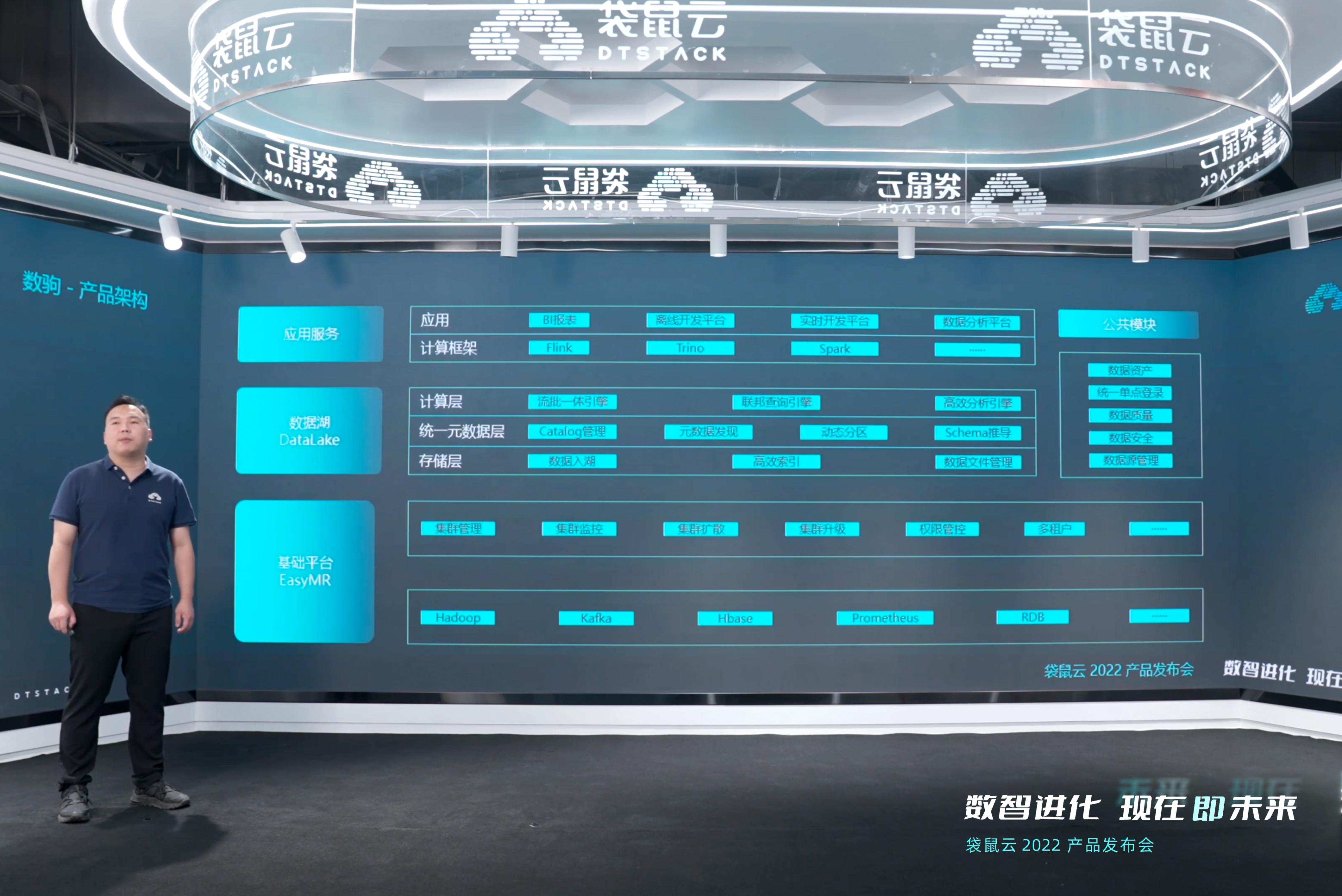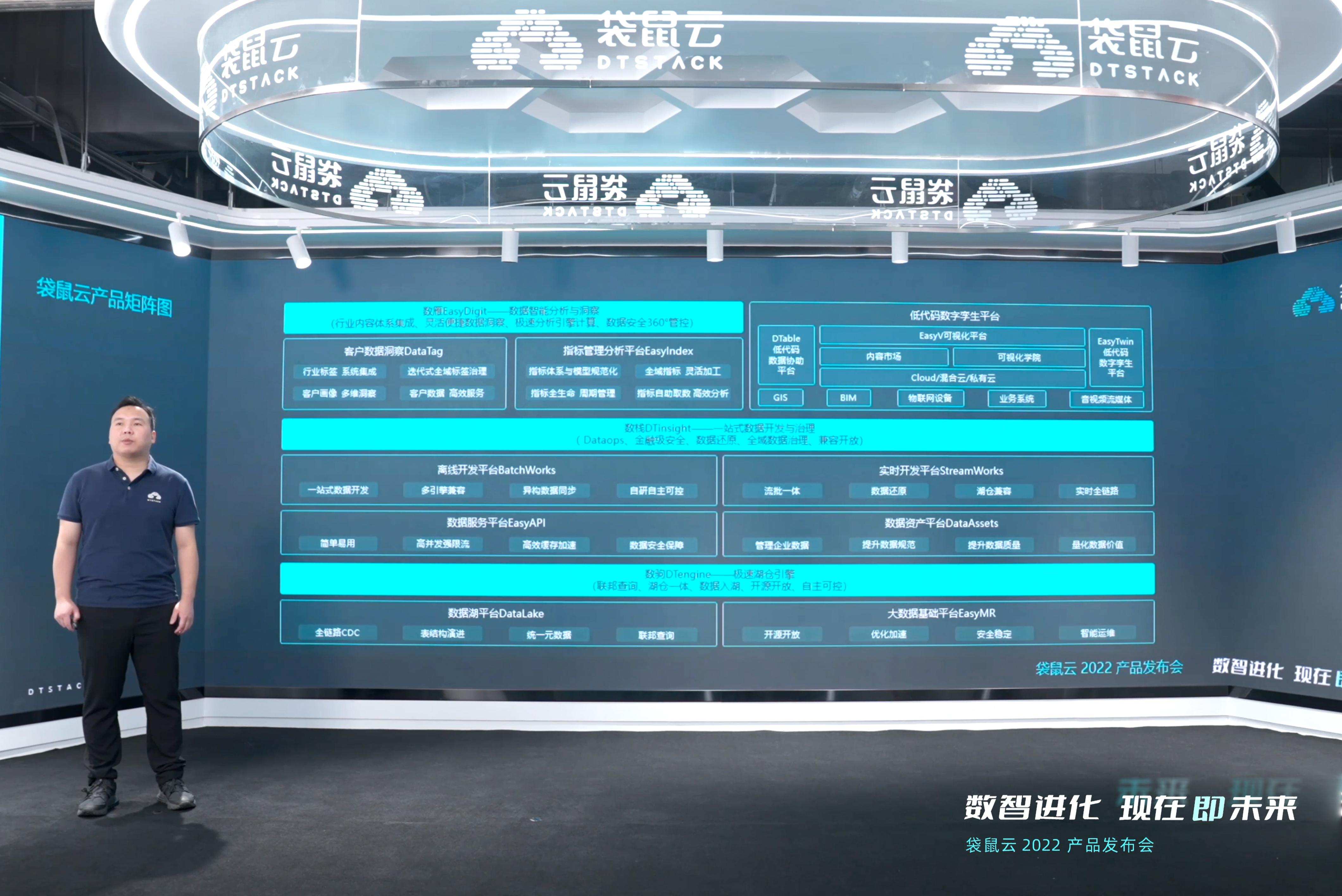 为此,袋鼠云对旗下产品进行全方位规划升级,以助力更多企业可以一站式完成数字化转型。会上,袋鼠云产研负责人思枢正式宣布了袋鼠云四大全新产品体系:数据智能分析与洞察平台“数雁EasyDigit”、低代码数字孪生平台EasyV、一站式大数据开发与治理平台“数栈DTinsight”和极速湖仓引擎“数驹DTengine”。四大产品体系提供从数据分析与洞察、数据可视化、数据治理、数据服务、数据计算、数据存储等全链路产品服务。