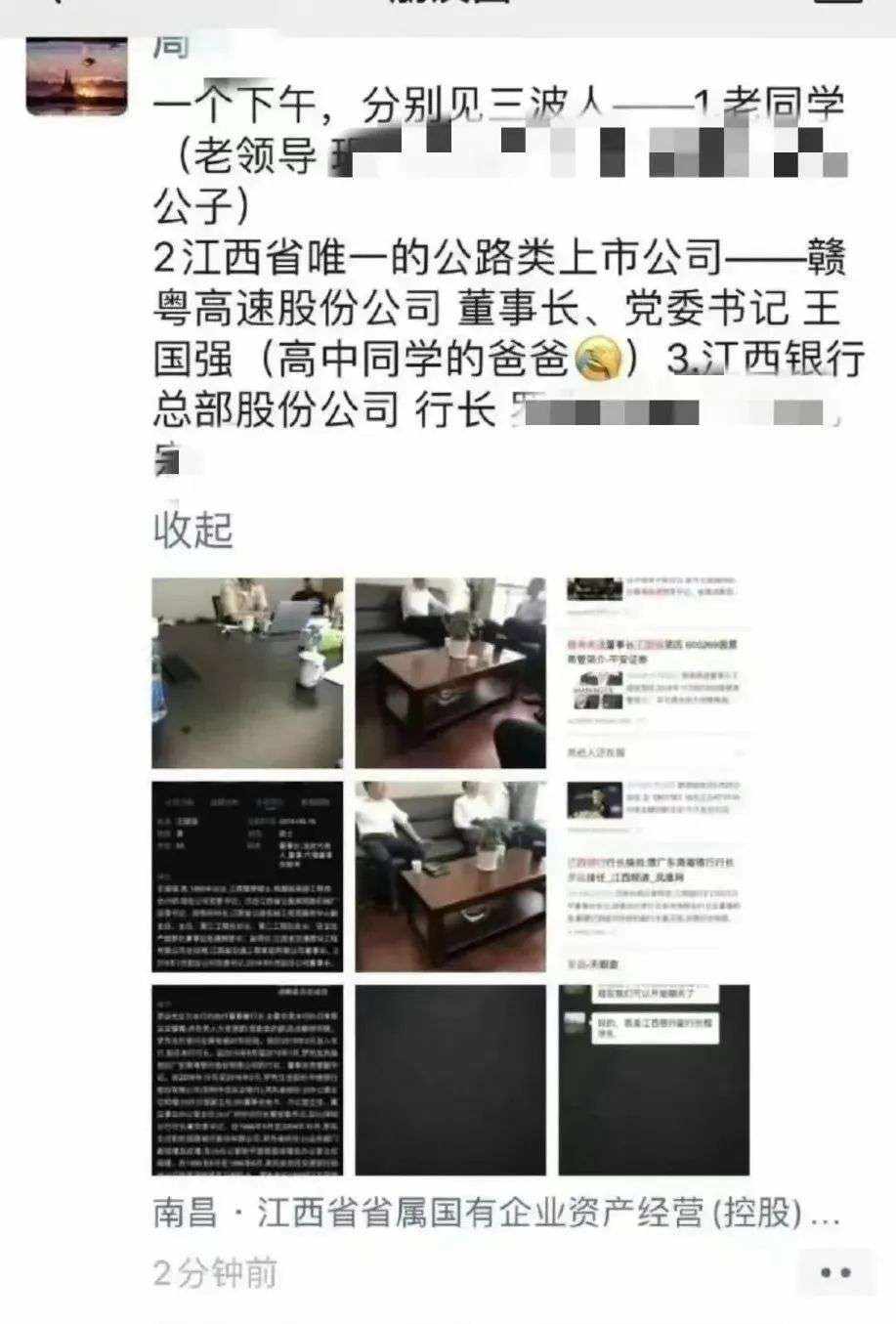 根据网传的周劼朋友圈截图,他曾表示“一个下午,分别见三波人”,其中一个就是赣粤高速董事长王国强。中新经纬查询赣粤高速年报发现,现年56岁的王国强确系赣粤高速董事长、法定代表人。不过,“周公子”是否真的拜会了王国强,就不得而知。据媒体报道,王国强近日回应称,自己与周劼并不相识,他是“儿子同学的同学”,自己曾经到周劼单位办过事情,“可能被他看见过”。