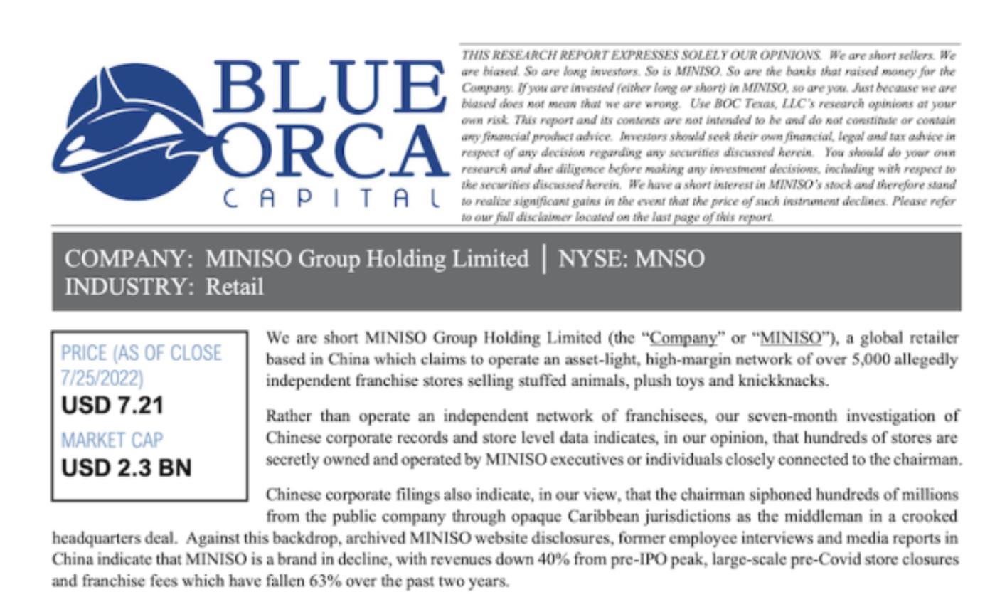 当地时间7月26日,国际知名沽空机构蓝鲸资本发布了一则长达30页的做空报告,直指名创优品的“多宗罪”。