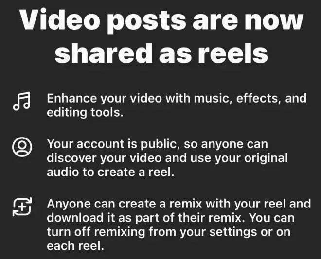 第二点改变是,大约一周前,Instagram 宣布,公开账户发布的 3 分钟以内视频,将默认以 Reels 的方式共享和推荐,这相当于扩充了短视频内容。
