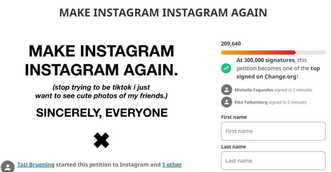 反击不止于此。上周末,Instagram 粉丝超过 32 万的摄影师 Tati Bruening,发起了「停止成为 TikTok」的线上请愿书,目前已有 21 万多人的签名。