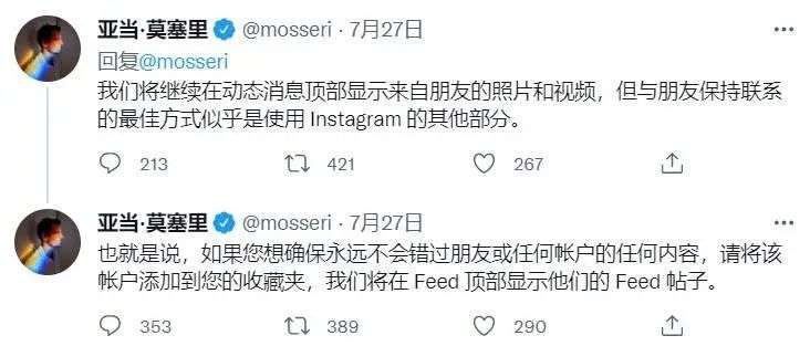 唯一不变的是,Adam Mosseri 承诺尽可能将来自好友的内容置顶,包括动态(Feed)的顶部和快拍(Stories)的最前面。