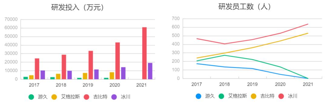 由上图可见,在费用投入上,游久和另外 3 家完全不在同一量级,艾格拉斯稍好,但效用与可信度存疑,在研发人员逐年减少的情况下,研发费用不降反升。