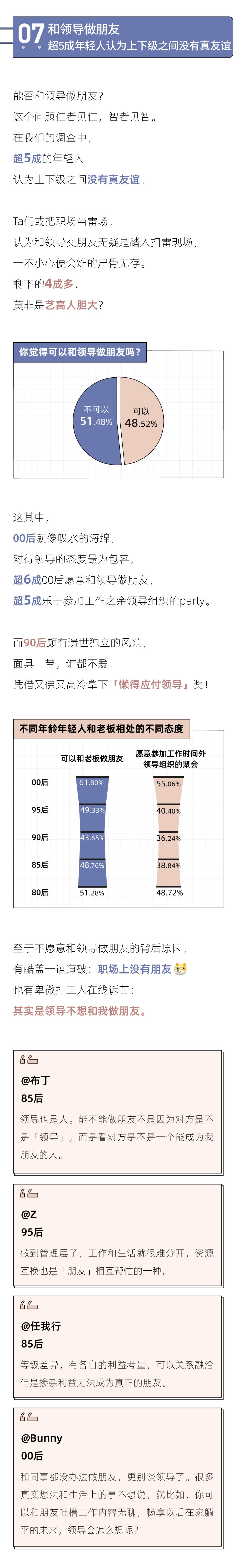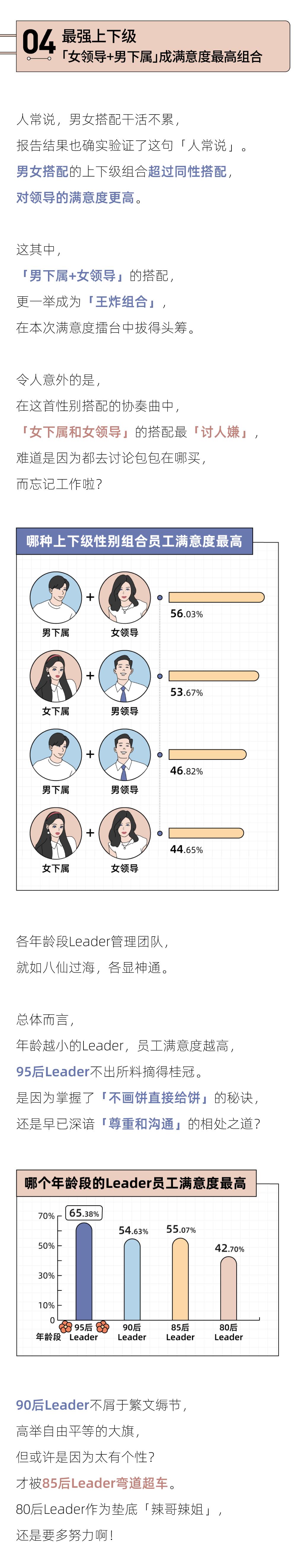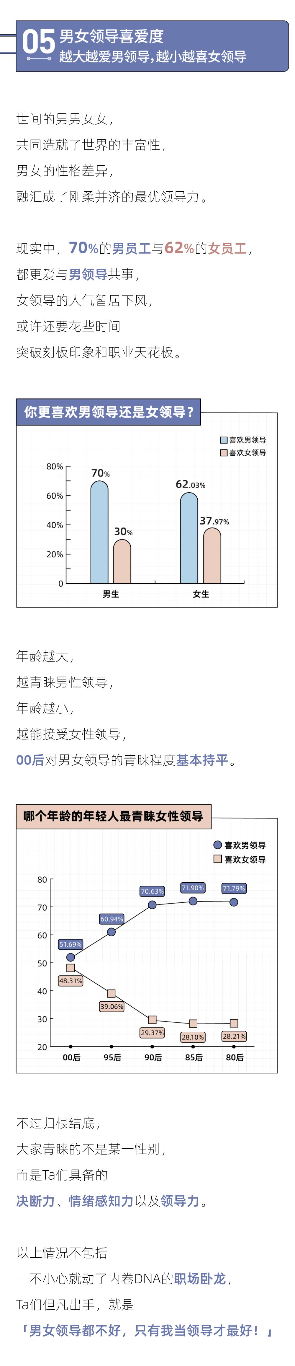 我们也发现了很多新的职场趋势,比如论资排辈的潜规则已经过时,当代年轻人只看能力不看年龄。95后Leader开始上位,他们和团队打成一片的领导风格完全不输前辈。
