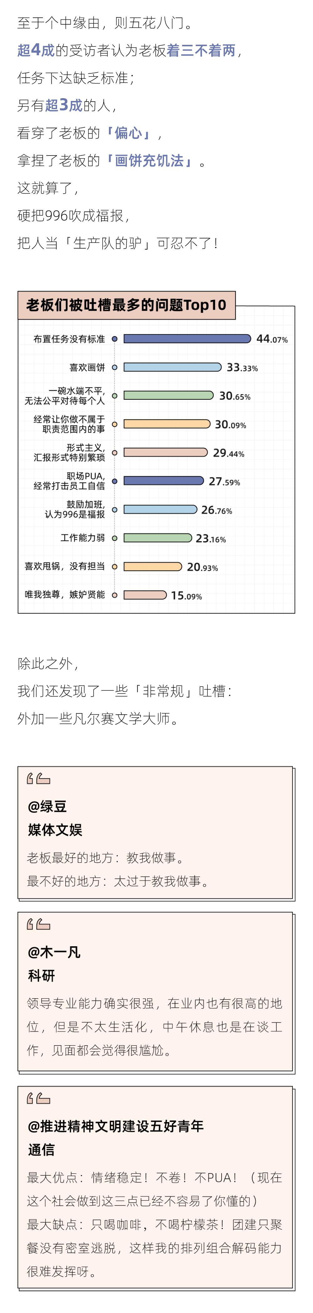 所谓千里马常有,而伯乐不常有,理想领导可遇不可求。情绪稳定、不卷、不PUA是打工人对于领导们的基本诉求了。有趣的是大部分人都渴望一位「朋友型领导」,但自己却无法真的跟老板做朋友,毕竟工作的苦水,谁敢无保留地跟老板吐呢?