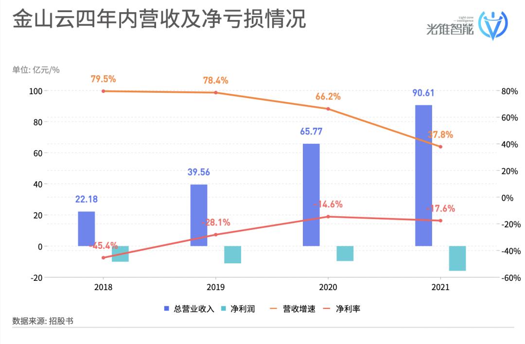 招股书中披露,2019-2021年间,金山云总营收分别为39.56亿元、65.77亿元及90.61亿元,2020年和2021年的同比增长分别为66.2%及37.8%。增速的趋势和云计算大行业一样,都在放缓。