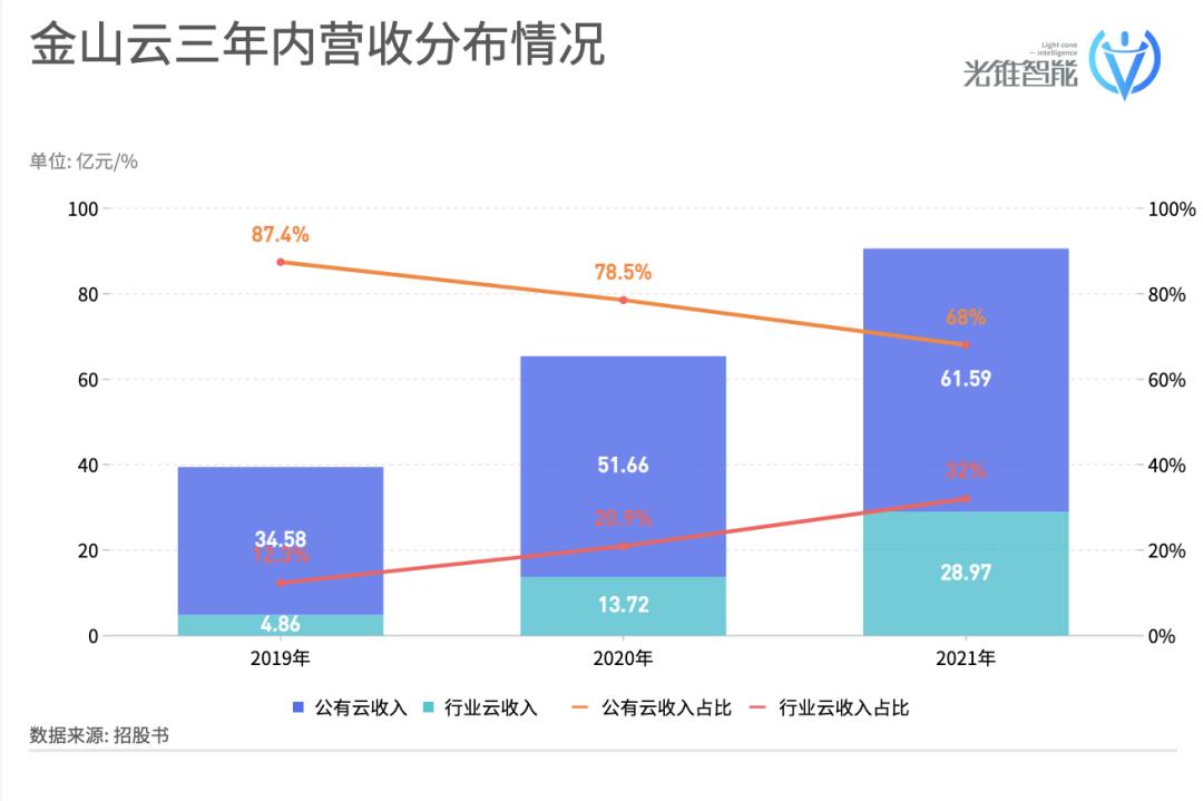 虽然当下金山云的主要收入来源仍为公有云服务,但行业云的部署和商业化正在加速。2019年、2020年和2021年,公有云收入占比为87.4%、78.5%及68%。行业云收入占比12.3%、20.9%及32%,截至2022年3月31日,行业云收入占比36.5%。