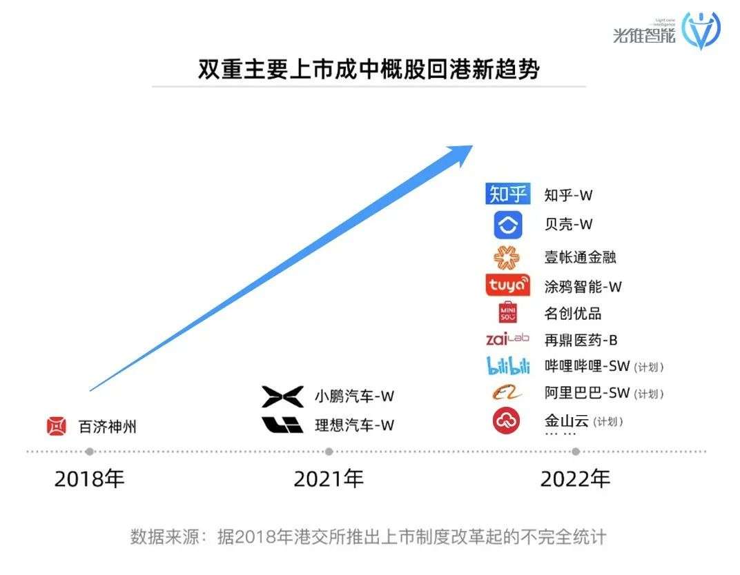 据光锥智能不完全统计,自2019年开始,每年回港上市的中概股成指数级增加,目前,已有知乎、贝壳、理想、小鹏等9家中概股公司,实现香港和美国双重主要上市。统计数据显示,自2019年至今,已有27只中概股以不同形式回归港股,包括先私有再重新上市、双重主要上市及二次上市等形式。