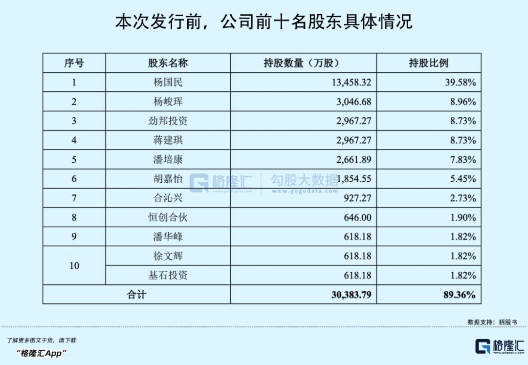 根据招股书,杨国民直接持有公司 39.58%股份,为公司控股股东。公司的实际控制人为杨国民、杨峻珲父子,两人分别直接持有公司 39.58%、8.96% 的股份,杨峻珲通过恒创合伙、童子合伙、小外甥合伙三个员工持股平台间接控制公司 共 4.55%的股份,两人合计控制公司 53.09%的股份。