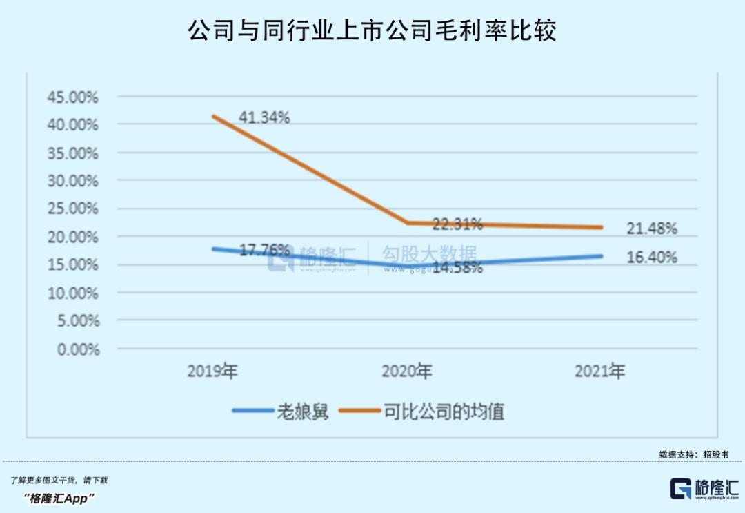 报告期内,老娘舅的综合毛利率分别为17.76%、14.58%和16.40%,低于同行的均值,除了产品定价较低之外,主要还是来自门店端的租金和薪酬等成本较高所致。