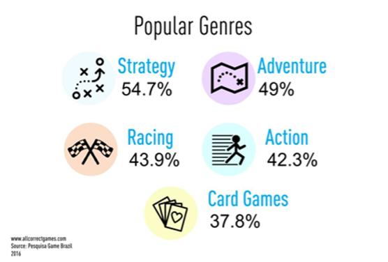 当前巴西游戏玩家中最喜欢的游戏类型依次排名为:策略、冒险、竞技对战、动作、卡牌游戏