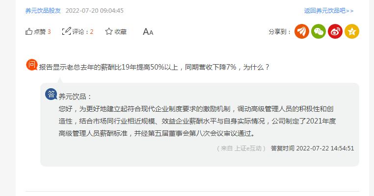 近日,有股民在投资者互动平台上向养元饮品(SH603156)提问“报告显示老总去年的薪酬比19年提高50%以上,同期营收下降7%,为什么?”而这一提问的市场背景是,养元饮品的股价刚刚经历了七连跌。