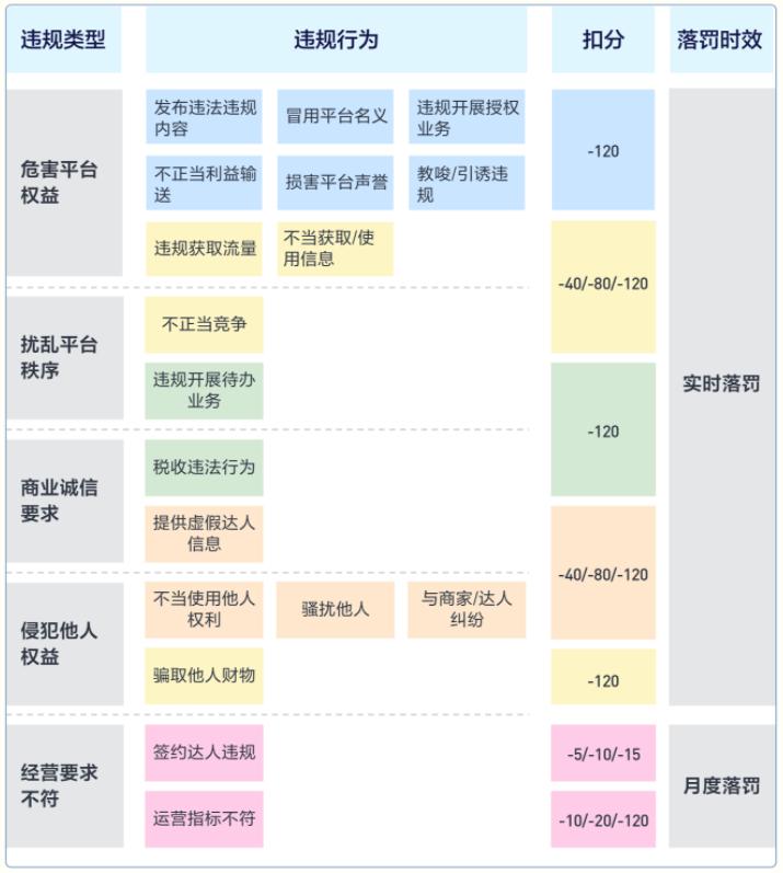 随后,抖音电商团队在6月份发布了《MCN机构信用分规则解读》,每个MCN机构初始信用分是120分,当机构违反平台规则时会被扣减信用分,不同信用分节点面临警告、暂停达人绑定、取消机构荣誉、清退等处理。