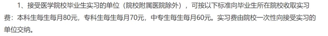 不同医院和医学院官网上通知的实习费收取金额也差异巨大:如河南省某医院公示的实习费仅为每月 50 元;而吉林某医学院官网上通告,其安排学生前往北京、大连等地的医院进行为期 8~10 个月的实习,收取的费用大多在 2400~5000 元之间。