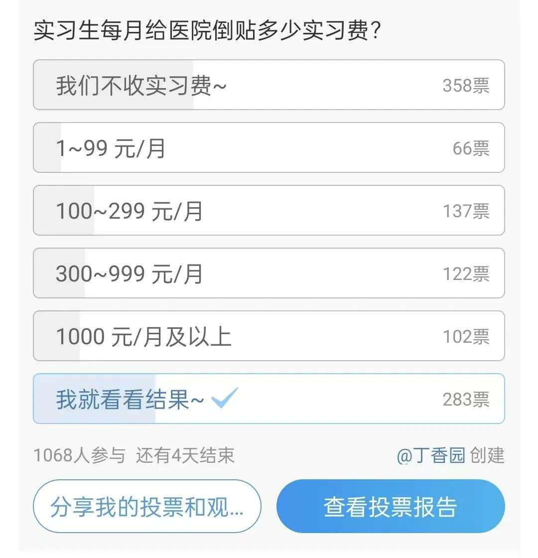 丁香园微博的投票显示:仅 45.6% 的实习生享受免费实习待遇。在其余需要缴费的学生中,月缴费低于 300 元的学生仅占 25.9%。28.5% 的学生则要缴纳超过 300 元/月的费用,其中 13.0% 的实习生每月缴费甚至超过了 1000 元。
