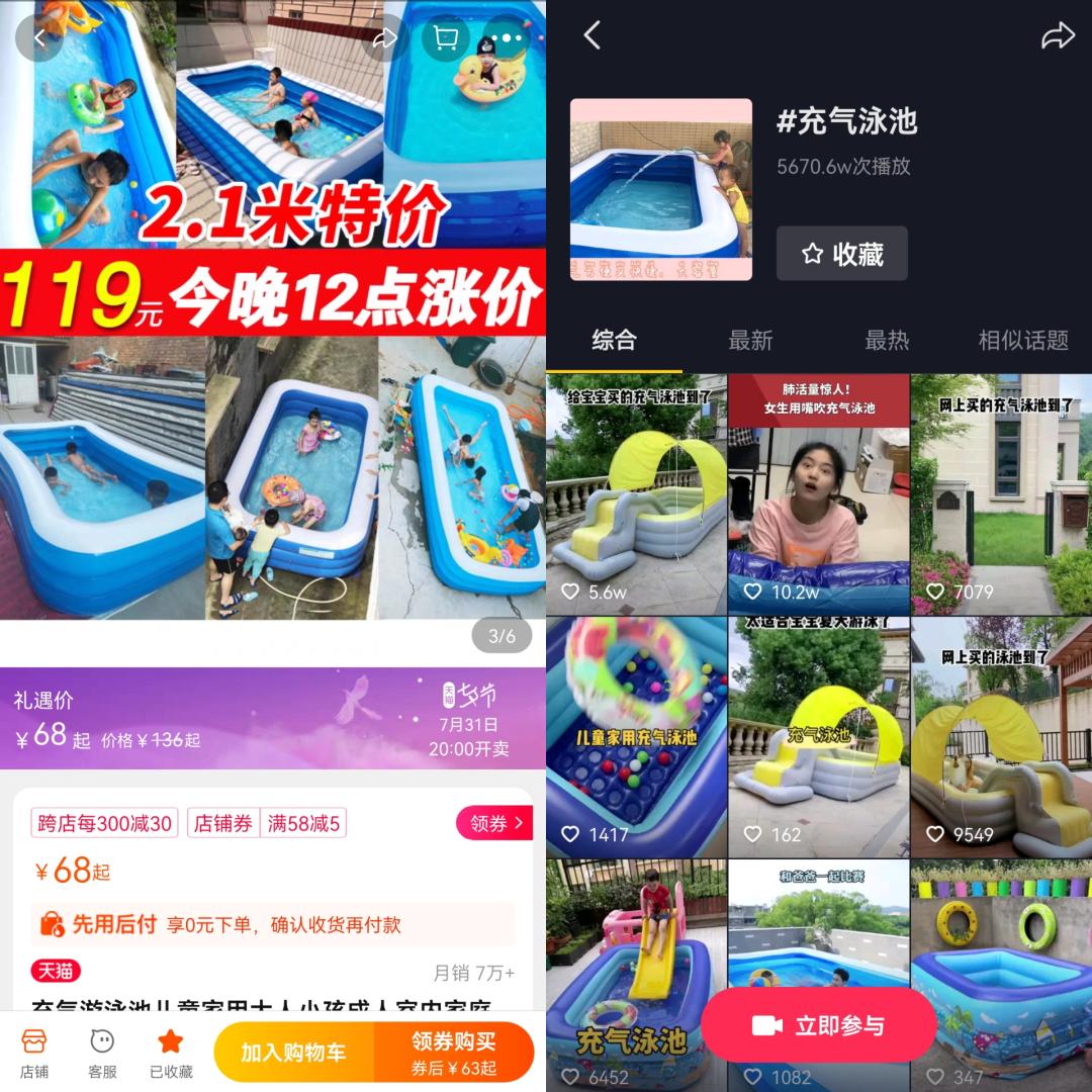 淘宝上,销量最高的充气泳池已经月销7万多件,小红书上有8000多篇相关的笔记,抖音上充气泳池的话题播放量也达到了5600多万次。