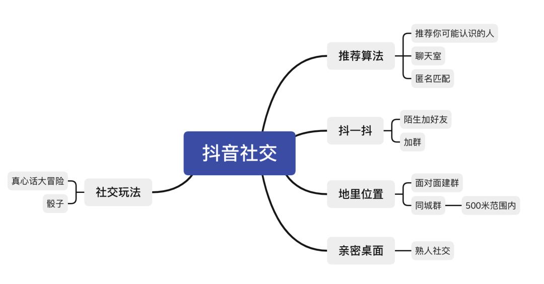 抖音在社交上主要布局了5个入口,以推荐算法和内容为基础,分别有社交玩法、手机桌面、地理位置和抖一抖来实现用户社交关系产生。