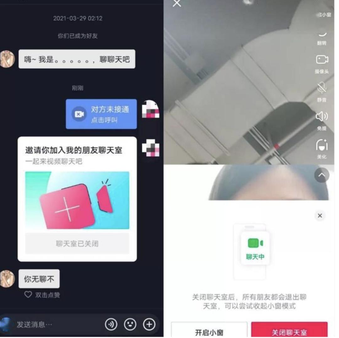 2021年4月,抖音推出了聊天室,其中匿名兴趣匹配以内容算法,通过短视频内容、和热点话题制造用户之间粘性的契机,再以共同互相关注的好友才能展开聊天。