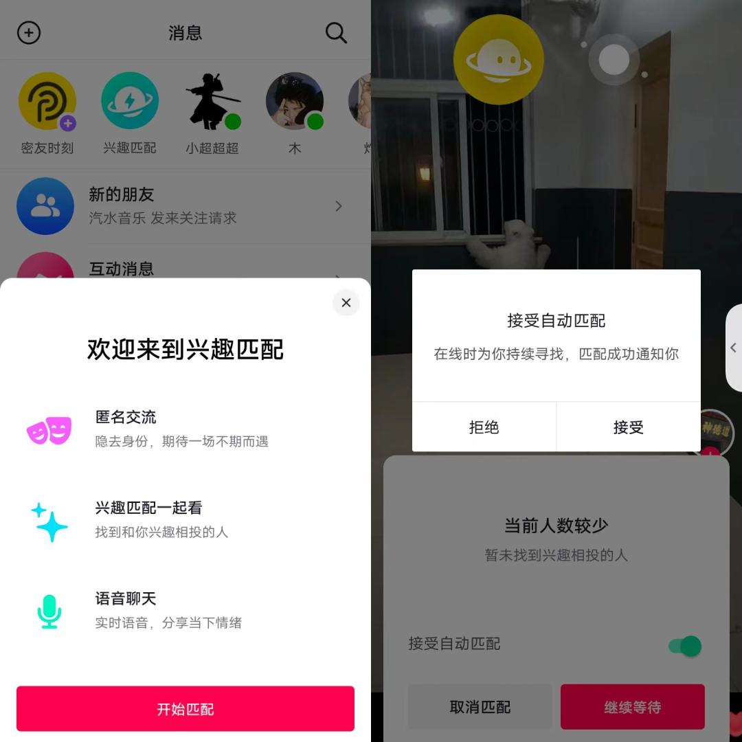 2022年5月,抖音上线了兴趣匹配功能,该功能主打基于短视频内容的兴趣社交,拥有“匿名聊天”、“兴趣匹配一起看”和“语音聊天”等特点。