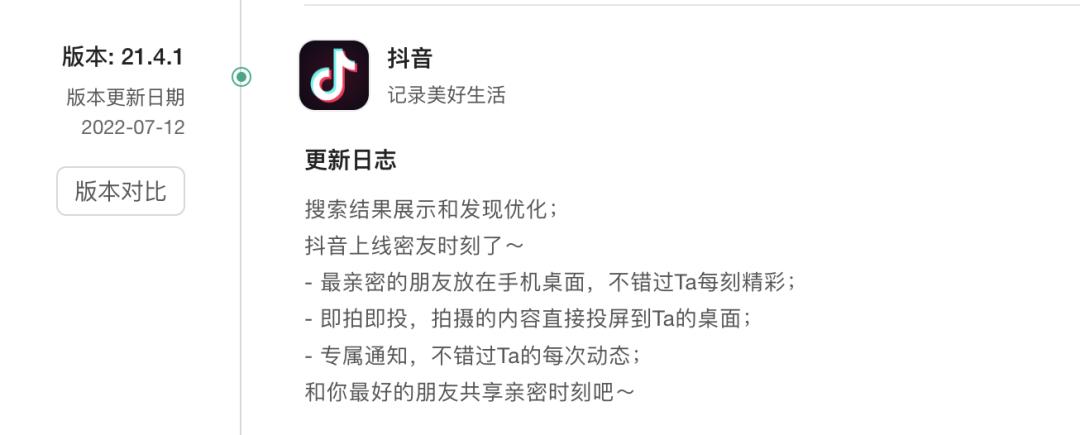 2022年7月,抖音更新了版本带来了新功能,支持了好友之间的桌面投屏,名字叫做:密友时刻。