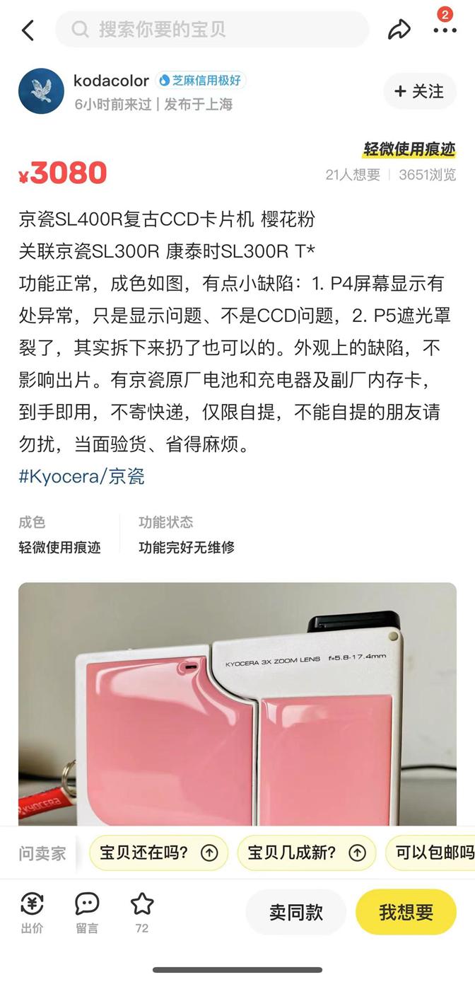 二手相机卖家安安对CCD的火爆表现出明显的不屑:“我这边没有推荐的CCD”。在安安看来,除了价格便宜,CCD没有任何优点,“完全是工业垃圾”,不值这么多钱。但是在购入CCD的消费者那里,CCD好像不仅仅只是一个拍照工具。