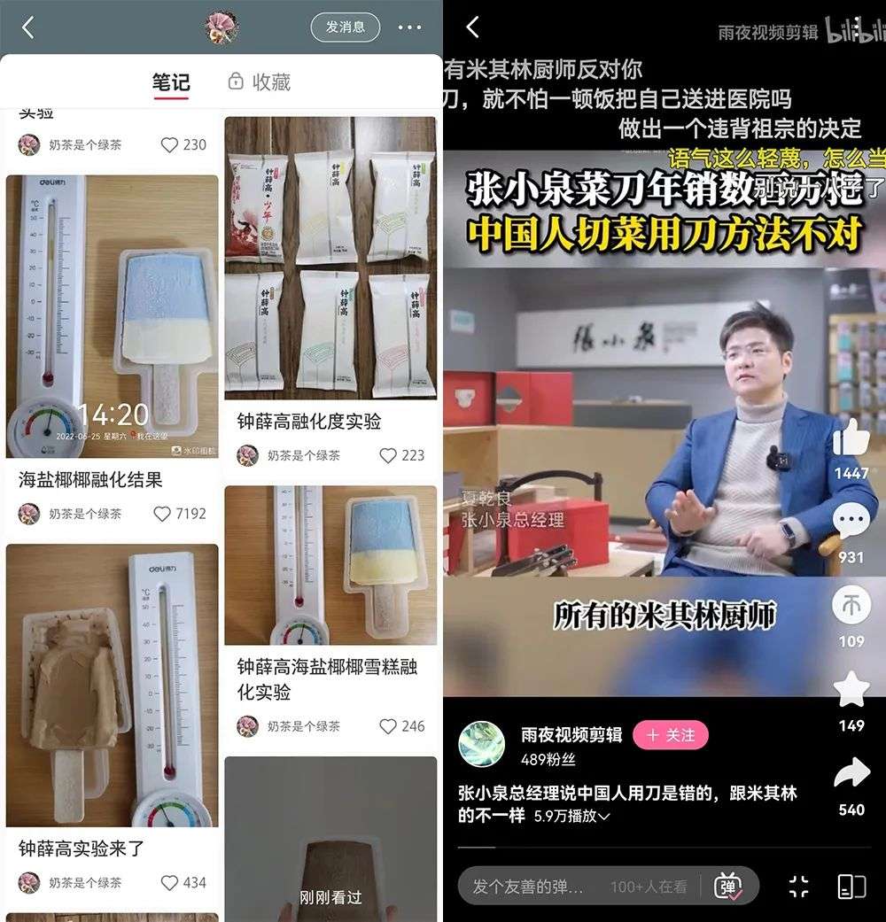 图左来自小红书(钟薛高),图右来自b站(张小泉)